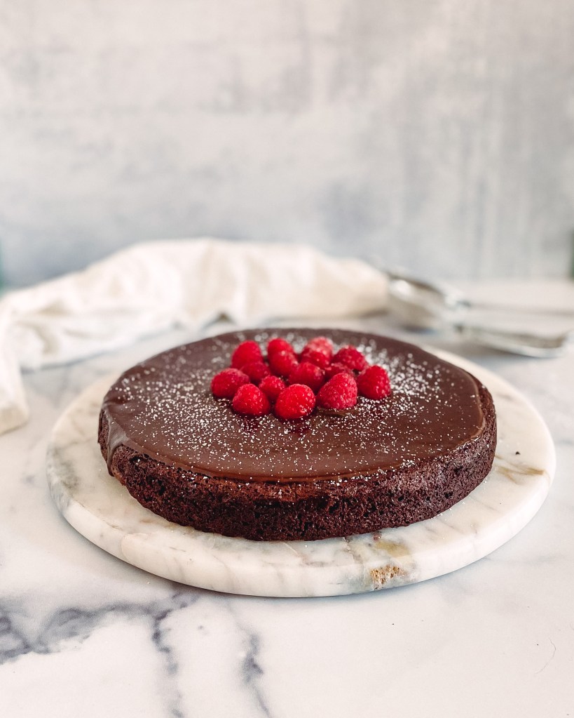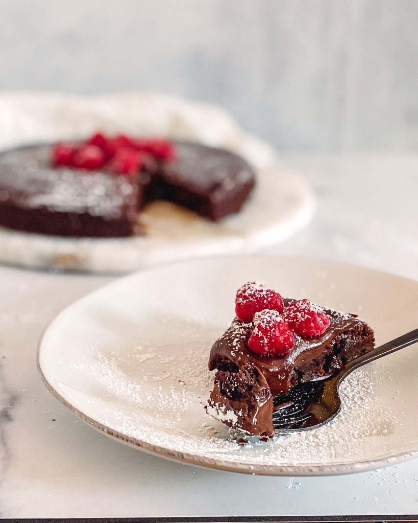 Flourless Chocolate Cake with rich chocolate ganache. Topped with fresh raspberries and a dusting of powdered sugar